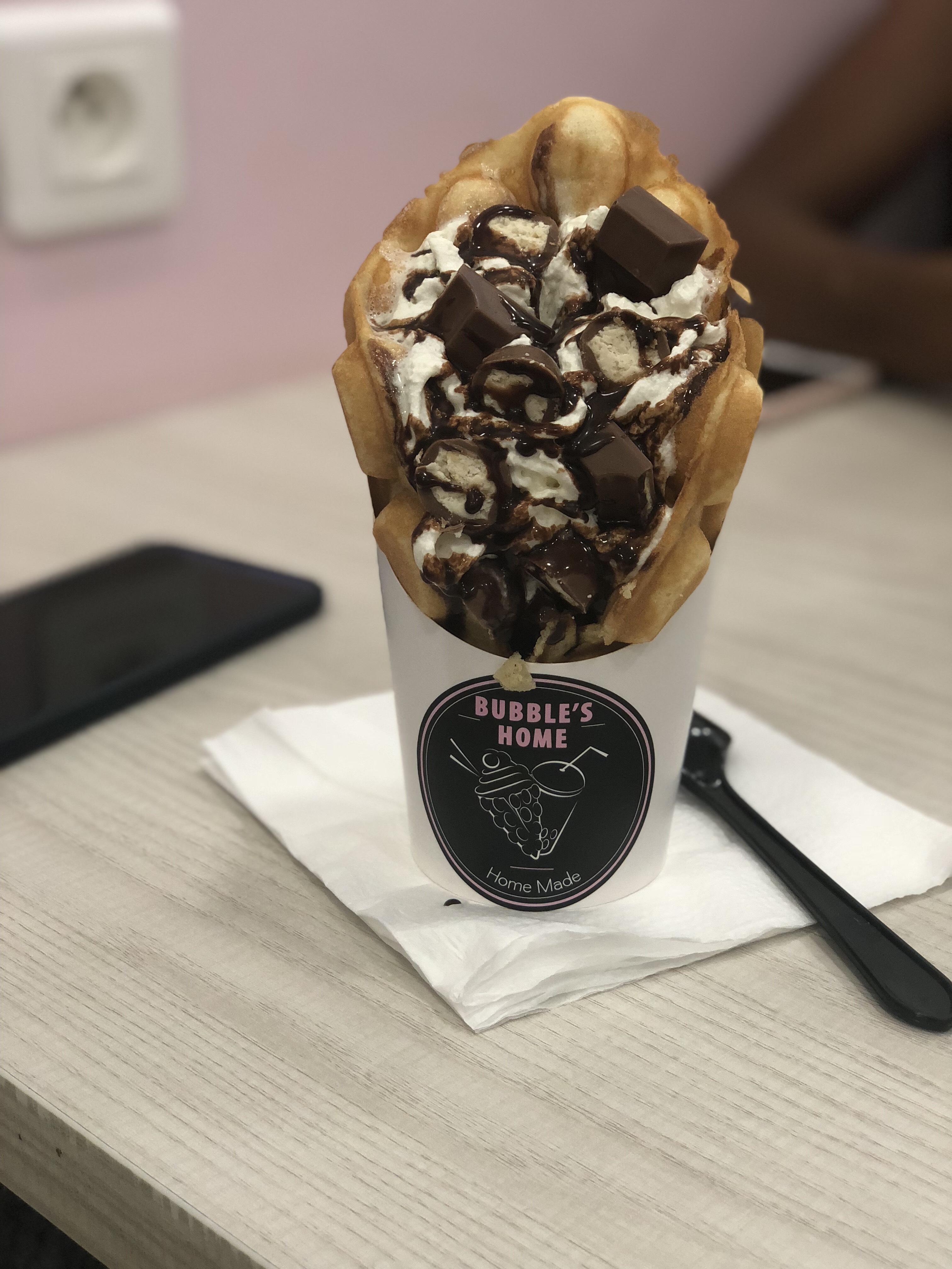Super découverte à Marseille - Le Bubble Waffle classique au caramel avec la chantilly, une pépite ! Petit plus, l'accueil est vraiment agréable !!