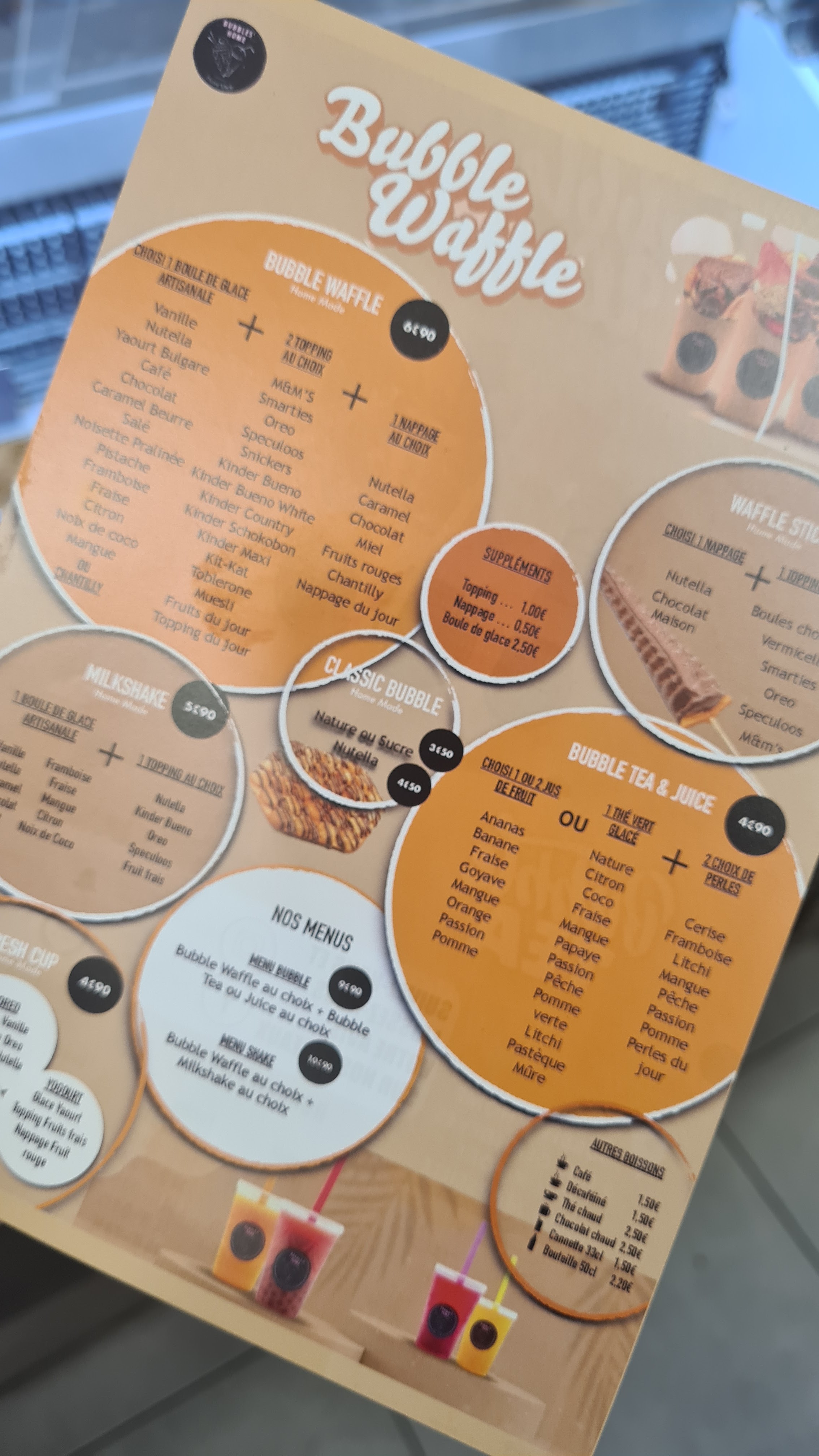 Bubble tea : vraiment bof, il y a d'autres bubble tea à Marseille qui proposent davantage de choix, ainsi que des combinaisons plus classiques (taro, matcha, haricots rouges) Bubble waffle : choix dans les combinaisons mais pris élevé (6,9€ la gaufre)