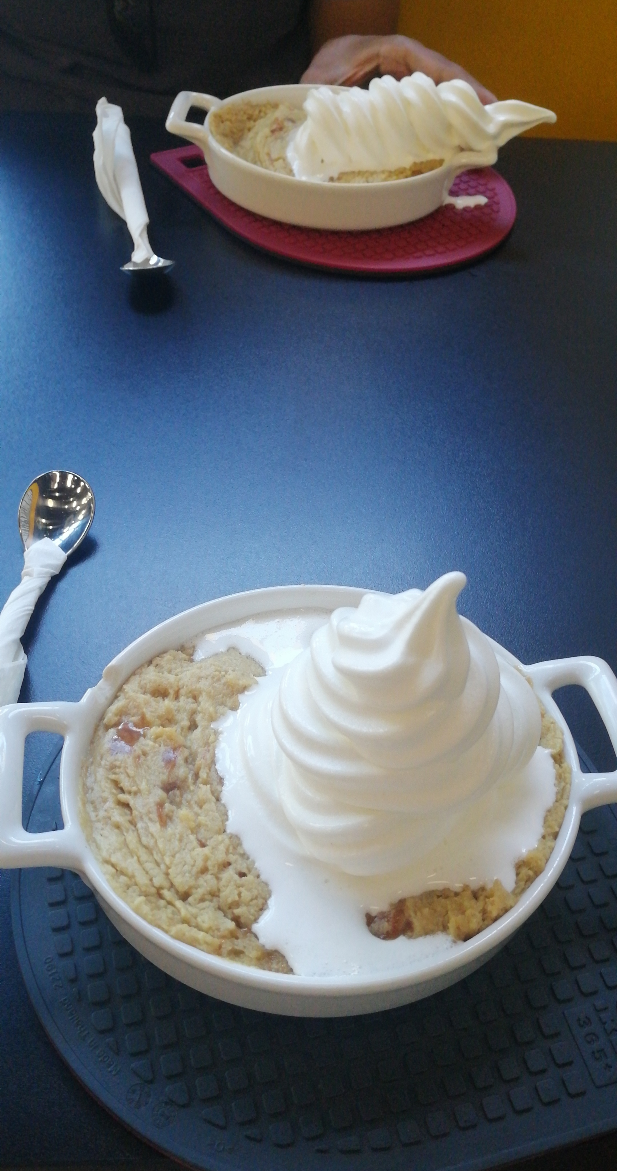 franchement j’ai eu ma glace en même pas 10 minutes elle était déjà fondue pour ma part attente et c’est grave si je peux me permettre glace à la vanille de base fondue qui ressemble fortement à la crème fraîche j’ai pas compris mais j’ai essayé de goûter J’ai même limite vu le sucre de la glace partir cookie, version béton de Greer entre mes dents, mais à part ça la dame super 10 110 merci