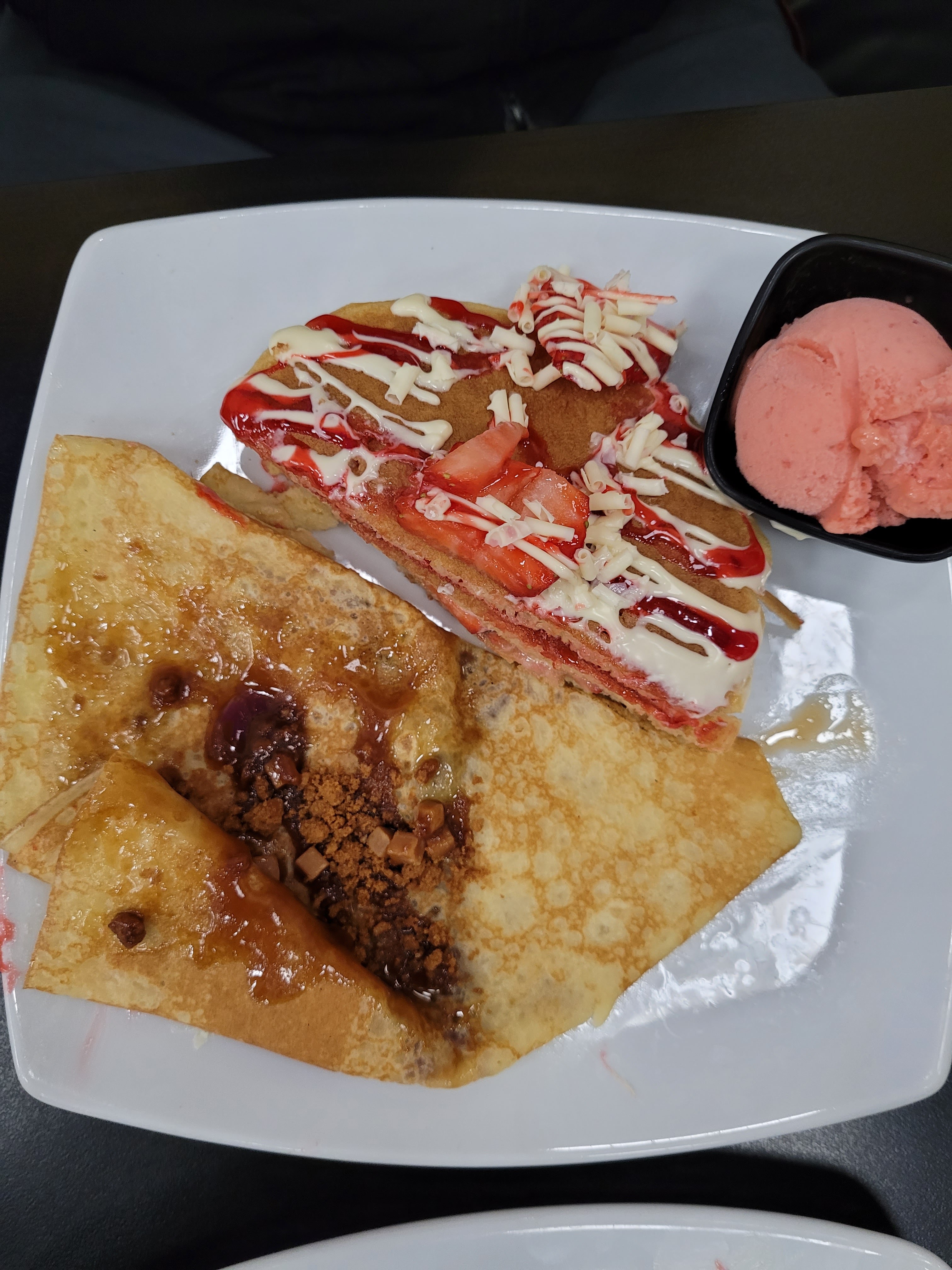 Nous avons commandé une crêpe caramel spéculos et un cookies mi cuit. On s’est régalé, vraiment délicieux