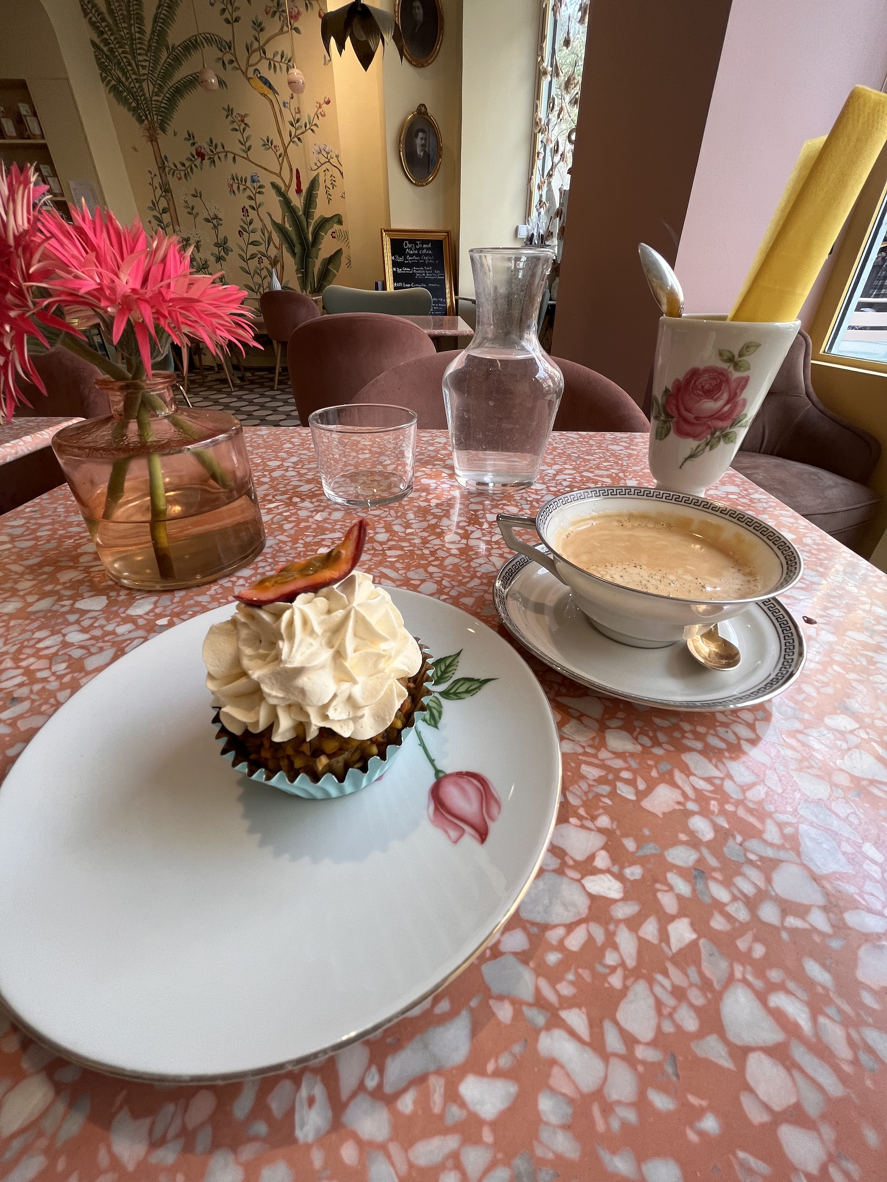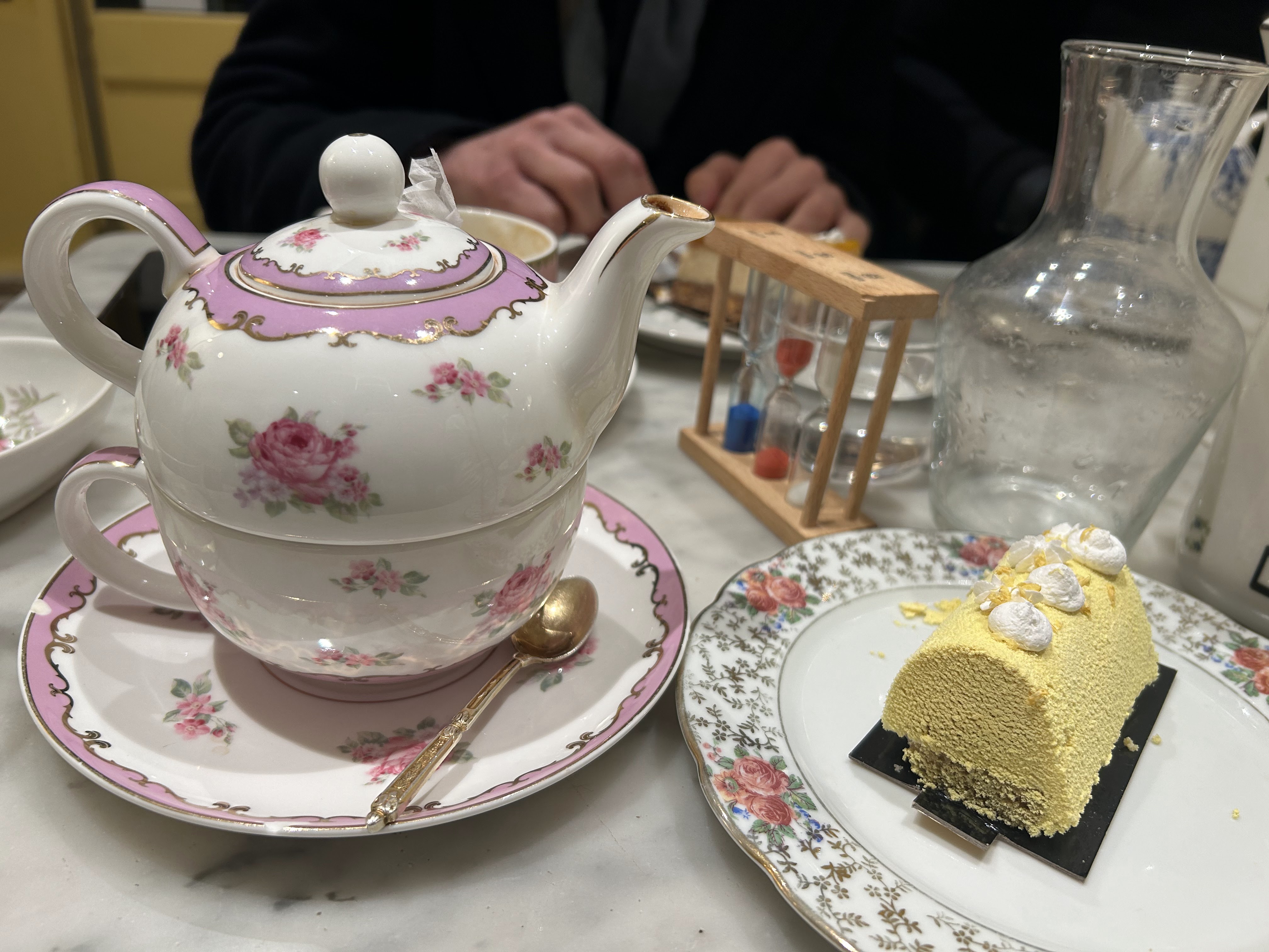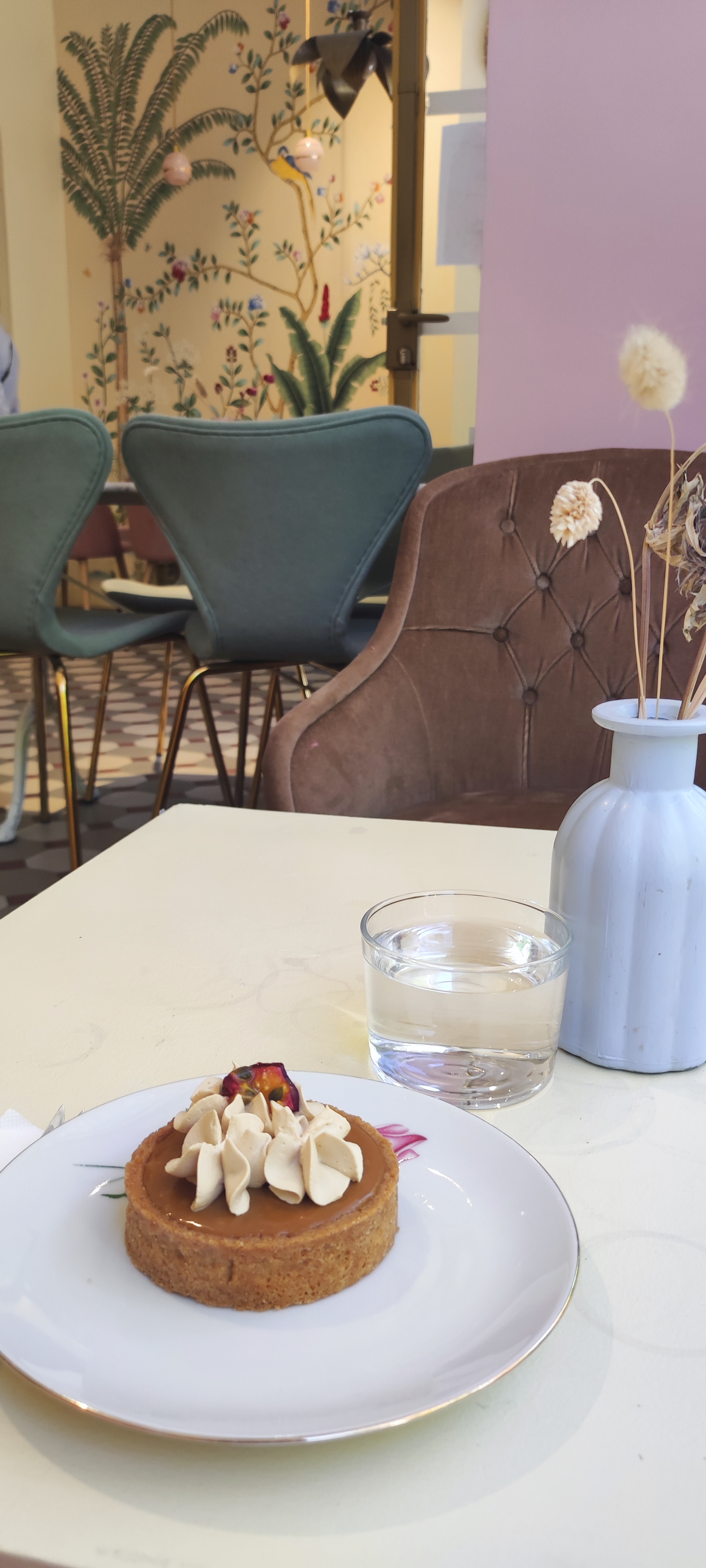 C’est un endroit charmant, avec une décoration intéressante et une vaisselle vraiment élégante, ce qui donne une première impression très positive. Cependant, notre expérience culinaire a été assez décevante. Nous avons commandé un Paris Brest, et malheureusement, le goût n’était pas à la hauteur : la base était sèche et le dessert manquait cruellement de saveur. Le prix du thé, à minimum 6.50 euros, est également assez élevé pour une boisson aussi simple. De plus, l’atmosphère souffre du bruit ambiant : il y a beaucoup de tables et, par conséquent, beaucoup de monde, ce qui nuit à l’ambiance cosy que l’on pourrait attendre d’une telle adresse. En résumé, c’est un lieu visuellement agréable, mais l’expérience gustative et le confort laissent à désirer.
